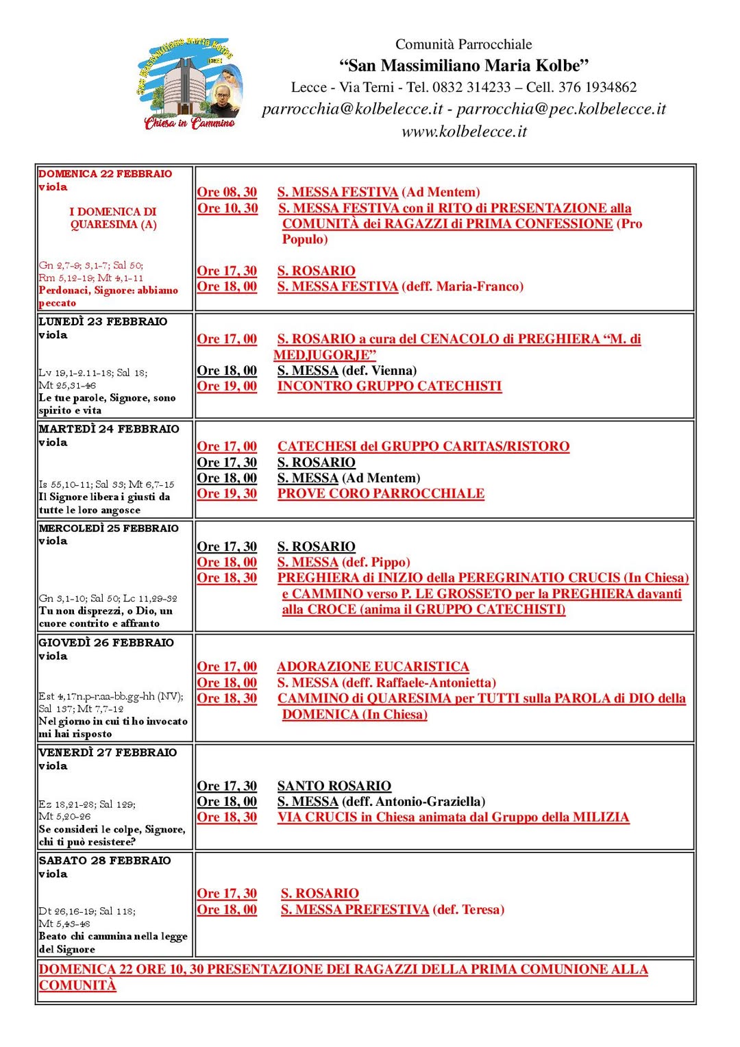 Avvisi della Domenica CALENDARIO LITURGICO-PASTORALE: Settimana dal 22 al 28 Febbraio Di webm - Febbraio 21, 2026 0 1 FacebookTwitterPinterestWhatsApp anche su Facebook